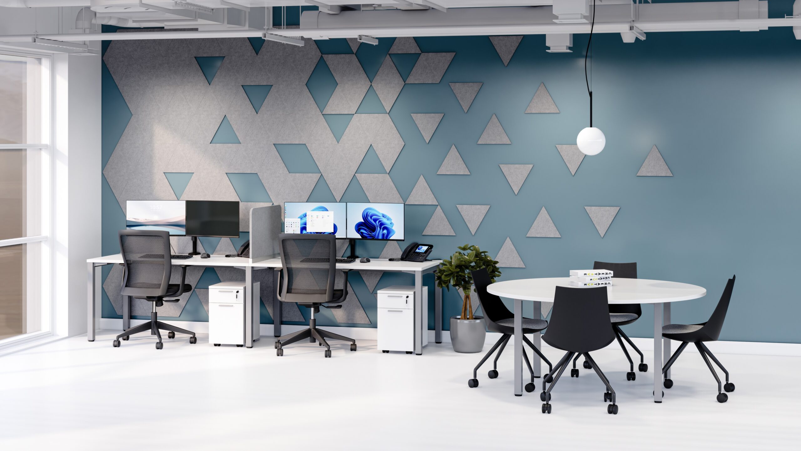 Dans nos bureaux à aire ouverte, nous mettons l’accent sur la création d’un environnement propice à la concentration, malgré les défis acoustiques inhérents à ces espaces.